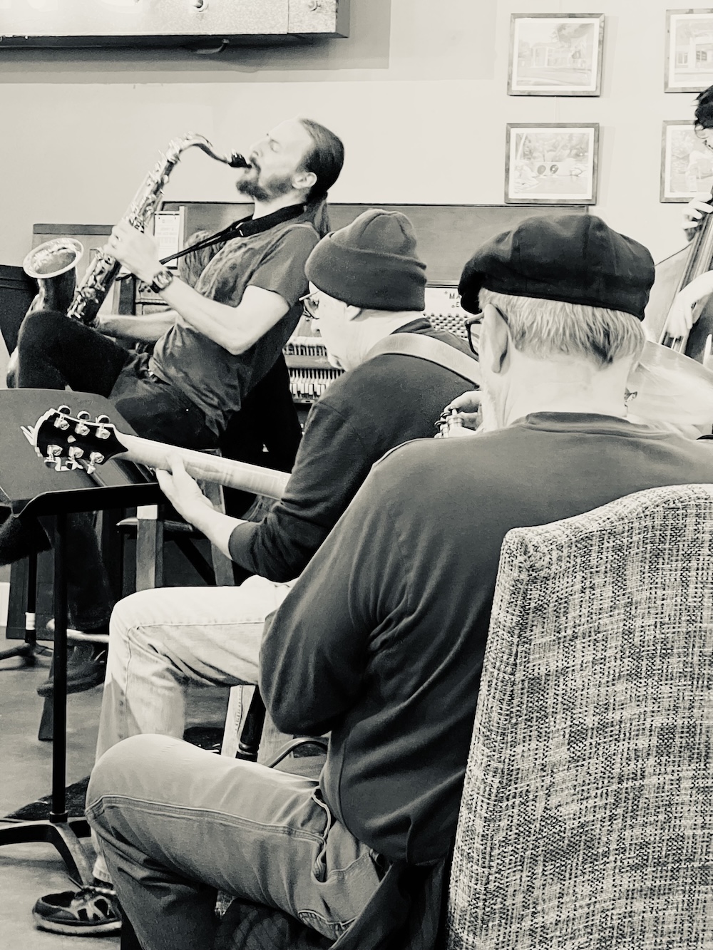 This morning I popped into a coffee shop for a rainy morning journal writing session and some sketching of unsuspecting patrons. Much to my surprise there was a live jazz group getting started. Once again my tiny 3×5 Art Creations sketchbook came in very handy. I carry it with me everywhere and will never go without one again. I had the best seat in the house for sketching. Somehow I managed not to draw too much attention to myself in my neon coral raincoat.