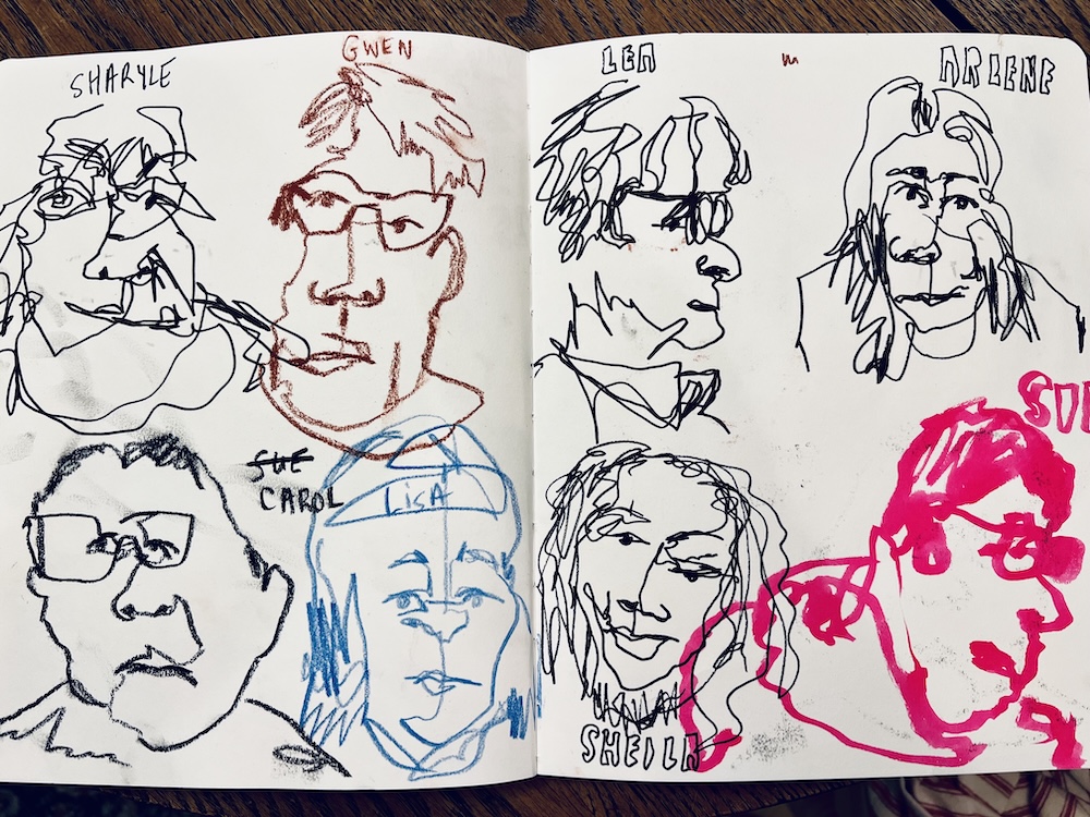 Art Mammals Inc. the solo-flying, middle-aged, art queens have been meeting regularly and I’m enjoying them so much. Yesterday in one of our groups we did 1 minute blind contour drawing then held 5 minute poses for each other. There was lots of laughter when everyone revealed their work. Nothing is better to shrug off the dismal state of the world than blind contours.